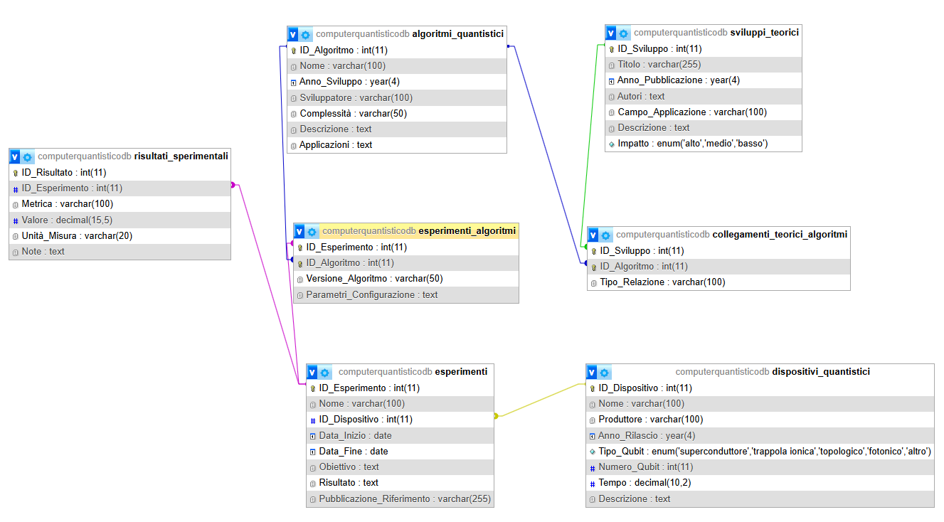 Questo database è stato pensato per raccogliere e organizzare dati relativi ai computer quantistici, ovvero, informazioni sugli algoritmi, sui dispositivi quantistici, sugli sviluppi teorici e sui risultati degli esperimenti.